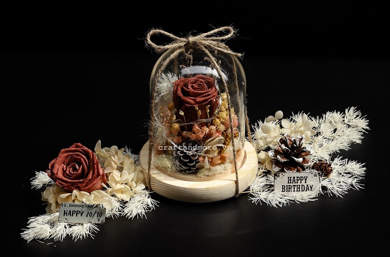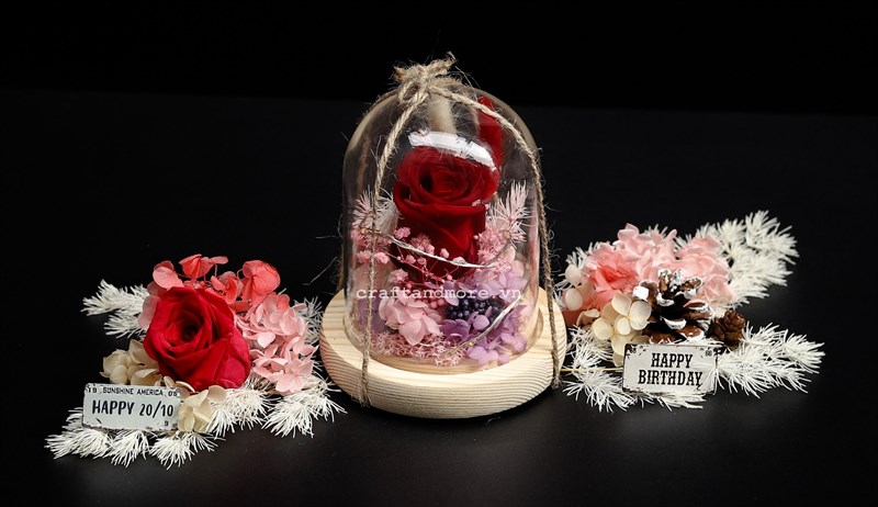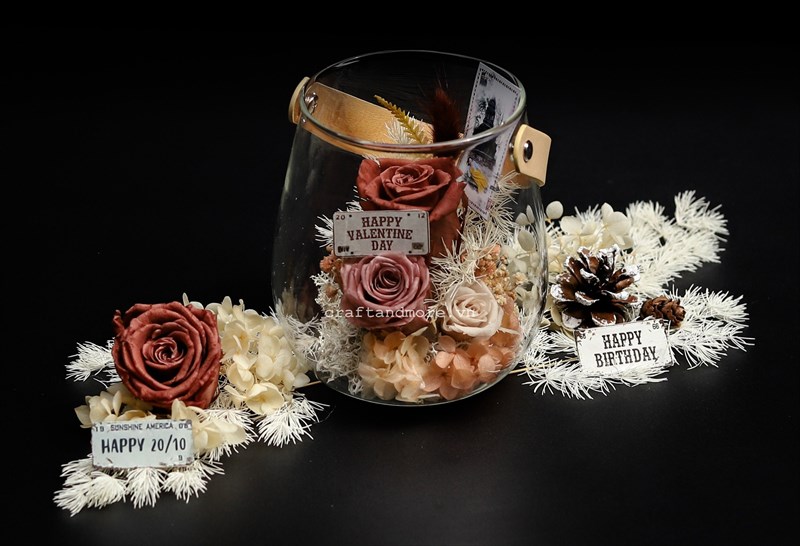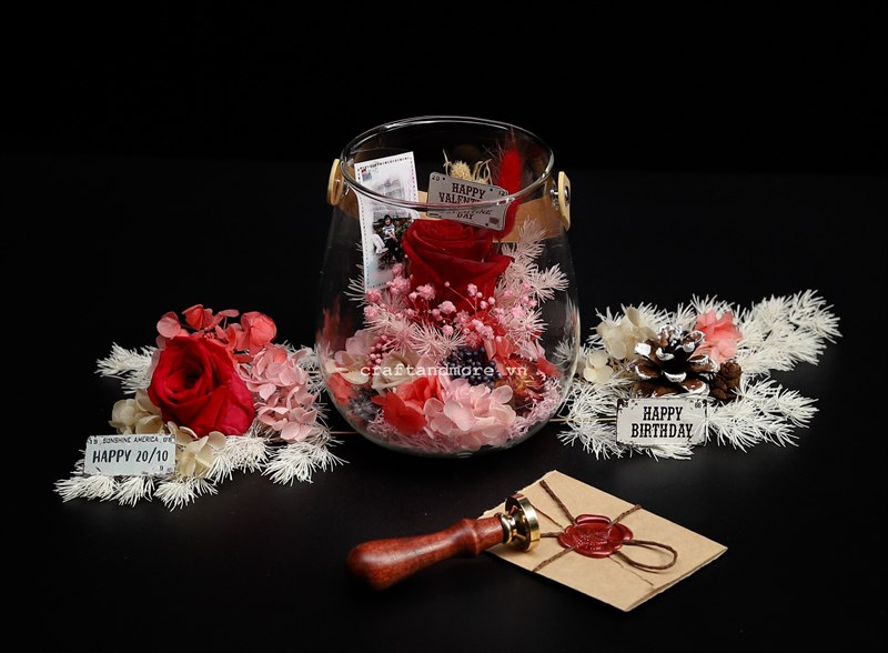 Những bông hoa khô đủ sắc màu trắng, đỏ, hồng, xanh được lựa chọn kĩ lưỡng và sắp xếp bố cục, tông màu có chủ đích theo "gu" vintage đẹp cá tính được làm thủ công hoàn toàn, đòi hỏi sự tỉ mỉ khi kết hợp nhiều loại hoa khô vĩnh cửu khác nhau trong bình thủy tinh.