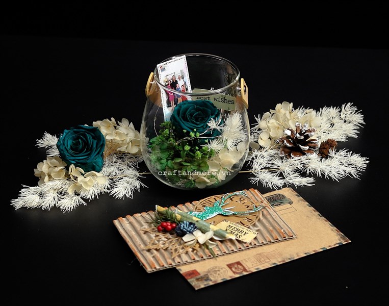 Được trang trí handmade tỉ mỉ hoàn toàn từ hoa lá cỏ khô (hoa thật) - hoa vĩnh cửu: hoa hồng; hoa cẩm tú cầu, thông bồng lai, hoa bi khô, bạch đàn lá tròn, tràm v.v...