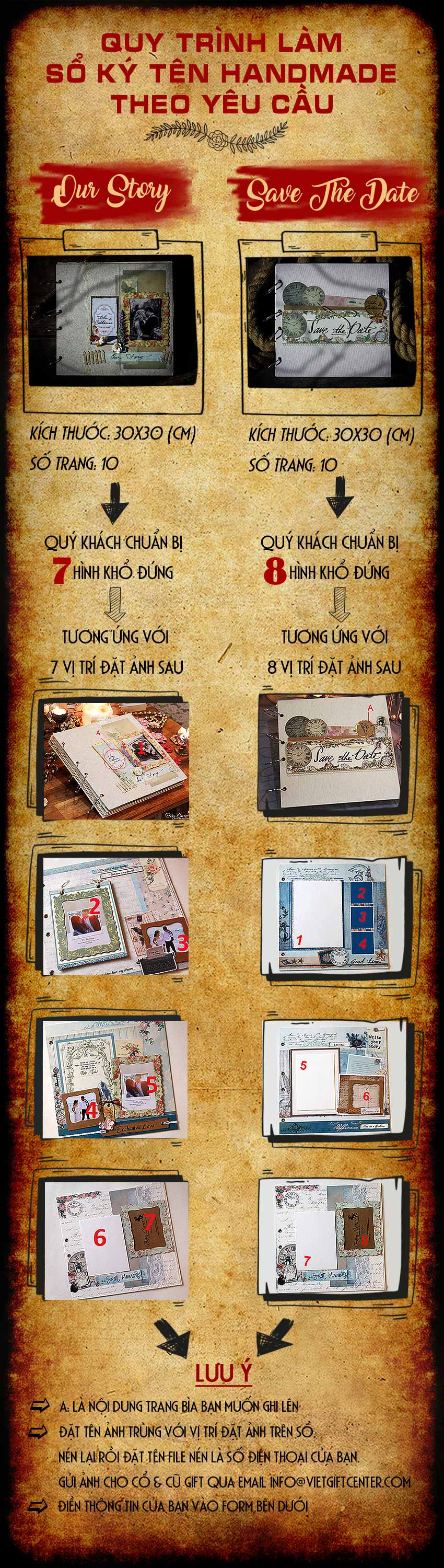 Album cưới handmade dùng để ký tên và dán hình trang trí tiệc cưới được làm bằng tay hoàn toàn. Sổ có tối thiểu 3 trang hình và 3 trang ký tên, chứa khoảng 10-15 hình;