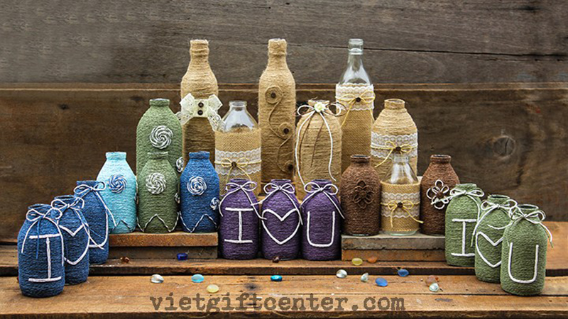 Để tạo thêm điểm nhấn và sự độc đáo cho chai thủy tinh bạn có thể kết hợp giữa dây thừng, vải bố và vải ren.