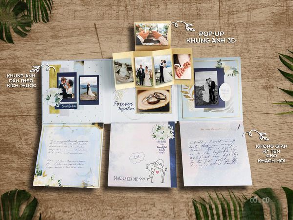 Sổ được thiết kế với một pop - up ở giữa (khung ảnh nổi) làm điểm nhấn đắt giá cho quyển album ảnh, với khung ảnh nổi tạo cảm giác sống động hơn, thực tế hơn. Bạn có thể dán ảnh vào, hoặc dán những tấm thẻ lời chúc hay nhất, ngộ nghĩnh nhất của khách mời vào đó...Khung ảnh thông mình vì có thể dễ dàng xếp gọn, nhẹ khi bạn gấp album lại.